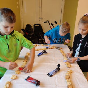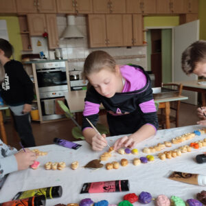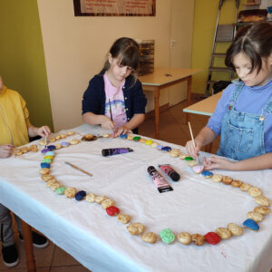 Jest to jedno bardziej z pracochłonnych zadań, gdyż korale trzeba nie tylko upiec ale także pomalować. Po przygotowaniu ciasta wypieka się je w kształcie serc i róż. Później poszczególne elementy są malowane farbami akrylowymi i farbami do szyb oraz lakierowane. Po ukończeniu wszystkich prac różaniec został zawieszony przy wejściu do świetlicy w miejscu, gdzie eksponowane sa prace dzieci.